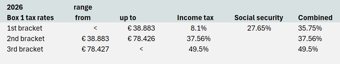 In Box 1 the combination of all work related income, income from principal residence (often negative income) and deductions for income insurances and life annuity premiums into a qualifying plan (see details below) are taxed against the following income tax and social security tax rates.