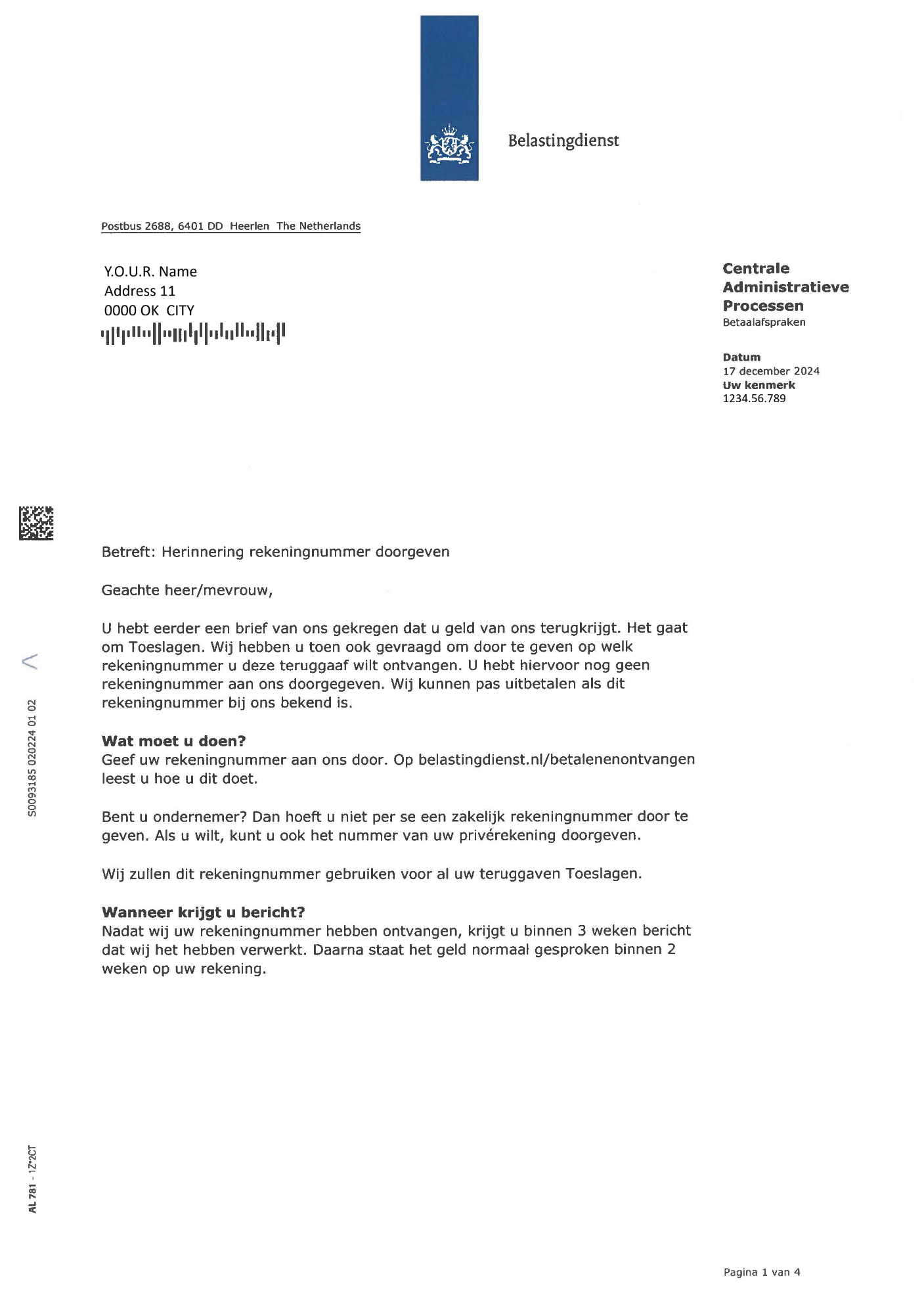 If you received this letterm the Dutch tax authorities do not have your bank account details for a tax refund that is waiting for you. They remind you because they have informed you with respect to the missing bank account number already.