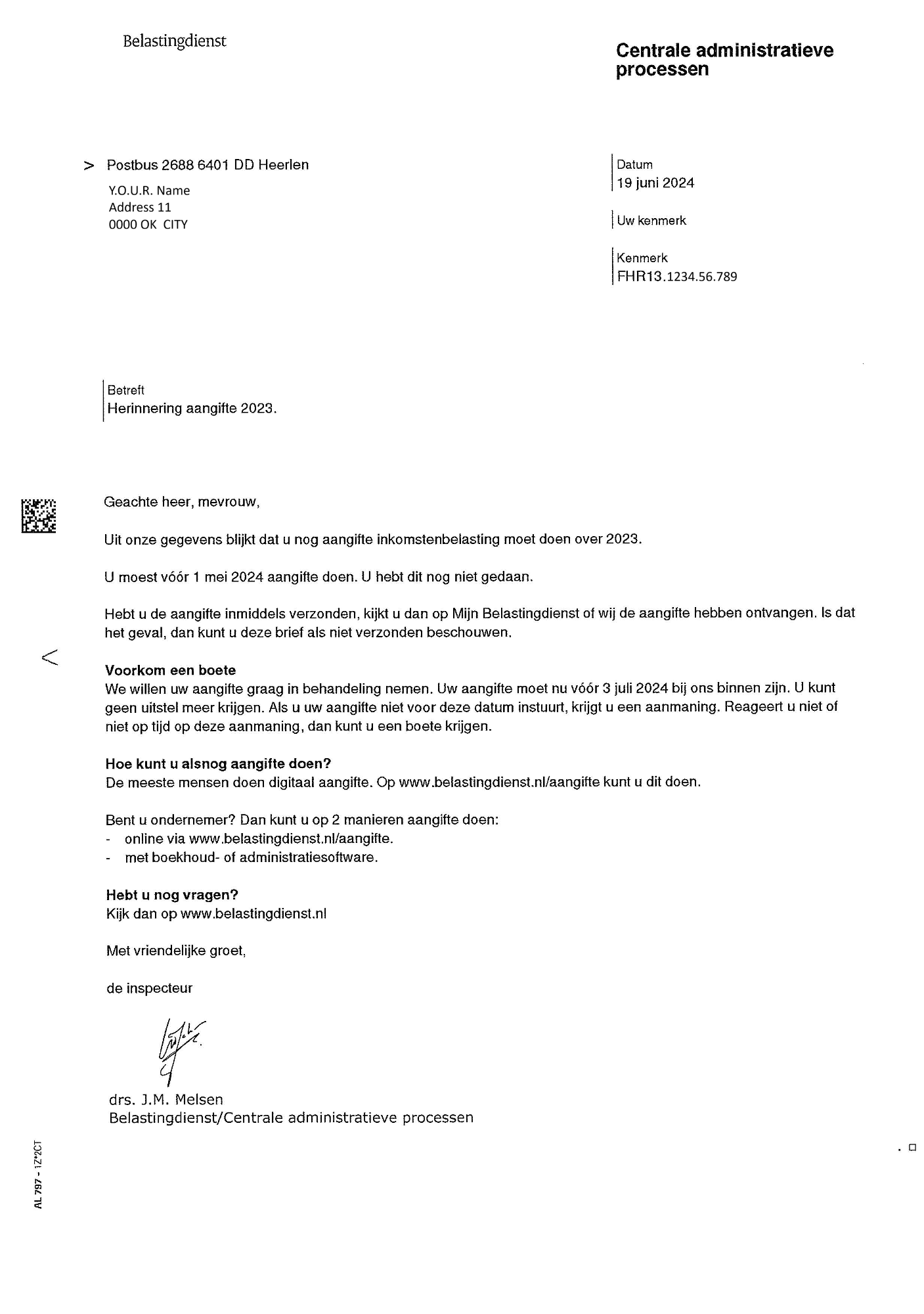 If you fail to take action within the given deadline, the Dutch tax authorities will follow up with an urgent reminder: "Aanmaning".